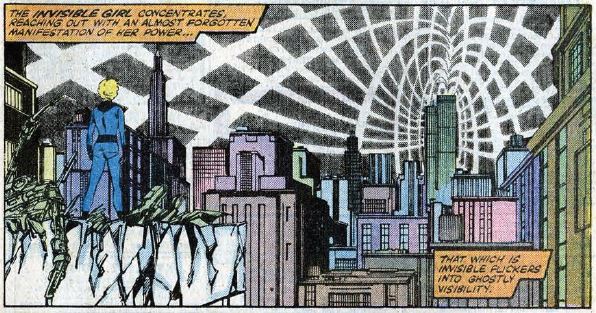 Fade out: Sue demonstrates one of her rarely-used powers, to make visible anything that is invisible. She does this with Terrax’s energy field around Manhattan, pushing her power to the limit.