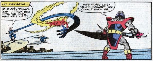 Our heroes dutifully reconvene at the Baxter Building, where Reed says a “space warp” has materialized around the city. Then, unimaginably, the top two stories of the building are destroyed! It’s Terrax, and he goes nuts with his powers. He punches Ben downward several stories, and then he throws Reed and Johnny around. Ben returns to the fight and punches Terrax out of the building and through several other buildings. Terrax doesn’t really give a reason why he’s mad at the FF, he just is.