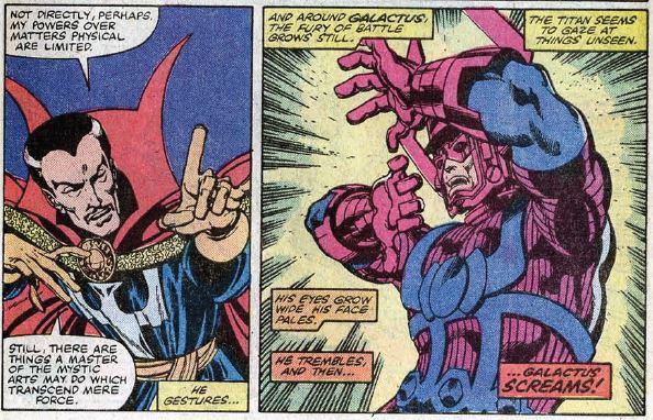 It’s Thor, who blasts Galactus with a classic “I say thee nay!” He’s on scene with three other Avengers, Captain America, Iron Man and Wasp. Begin fighting! The Avengers knock Galactus down to street level, using their powers against him in various ways. Dr. Strange shows up, and creates hallucinations that prey on Galactus’ fears.