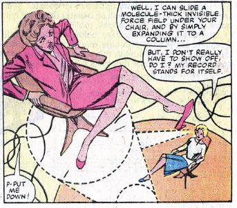 Fade out: Sue creates a soft, cushion-like force field for her to land on when she’s thrown from the building, another new use for her powers. During the interview, she makes a good case for how a woman who’s married and a mother can still kick ass.