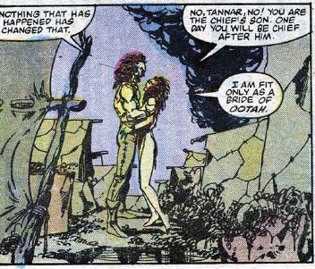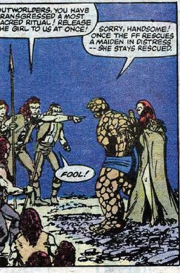 We begin on a planet in the Negative Zone where an alien woman, Taiya, is an outcast among her primitive tribe. The chief’s son, Tannar, wants to marry Taiya, but she says she can’t because she’s only fit as “a bride of Ootah.” A strange object falls from the sky and crash lands nearby, so Tannar and the rest of the tribespeople investigate. It’s the Fantastic Four, landing on the planet in their exploratory module.