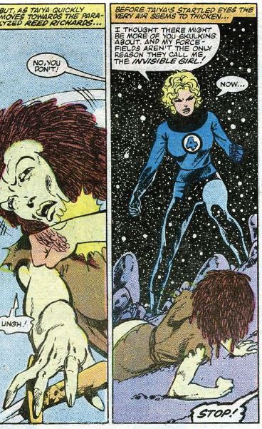 Fade out: During the fight, Sue plays defense, invisibly protecting the unconscious Reed while her other two teammates battle the natives.