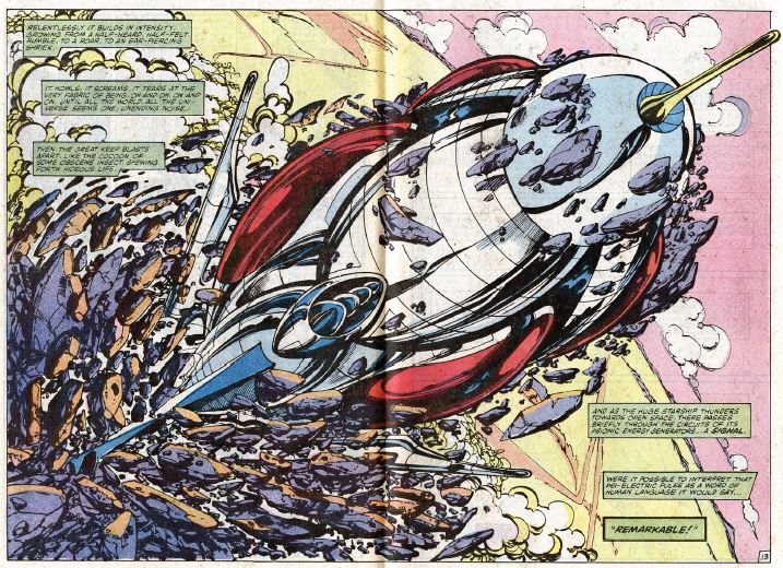Two weeks later (!), Reed has devised a helmet that allows the computer animate his body, but his mind is still not actually in his body. Okay, sure. The ship heads back to that space tunnel thing from issue #251, only to find it destroyed. On the viewscreen, the FF sees an image of Earth before them. Reed deduces that the two universes are being drawn together, towards mutual annihilation. (Yes, Reed actually says the words “mutual annihilation.”)