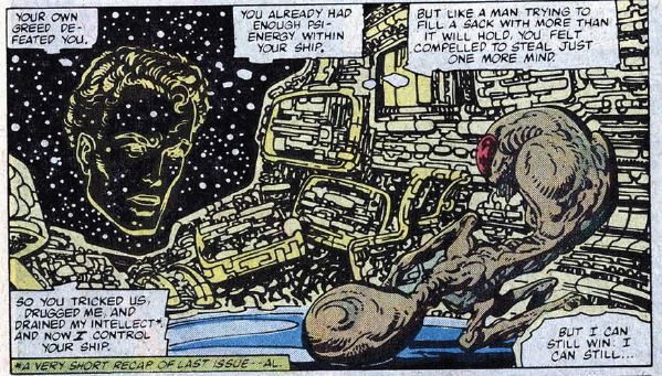 The FF, with Ben carrying Reed’s body, continue to fight their way through the ship. Taranith is about to open a hatch and throw them out into the vacuum of space, but something stops him. It’s… Reed! Reed’s mind/consciousness/whatever has taken over the ship’s computer , and he’s now in control of the whole ship. Taranith hops into an escape pod and takes off, but the pod malfunctions thanks to years of misuse on the planet, and it explodes. An image of Reed’s face appears on a viewscreen. He says he’s set a course for Earth, and he’ll work on a way to getting his mind back into his body.