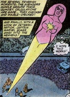 Photonic: This is actually Captain Marvel’s first day on the job as an Avenger. Except that she joined the team back in issue #227. She reveals that the events of last seven Avengers issues — including battling the Masters of Evil, rescuing the U.S. President, Jocasta’s funeral, Iron Man quitting the team, and the fight with Plant-Man — all took place on the same day as this issue.