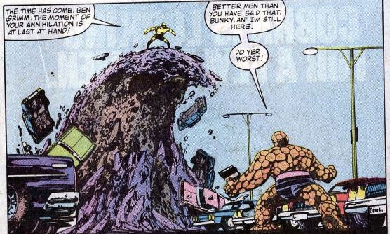 Clobberin’ time: The reason why Ben is returning to New York is because he had just been in the southern U. S. in The Thing #3, dealing with Lucas, a creepy mutant child. Lockjaw teleported Lucas to the moon, leaving Ben on Earth and forcing him to fly commercial.
