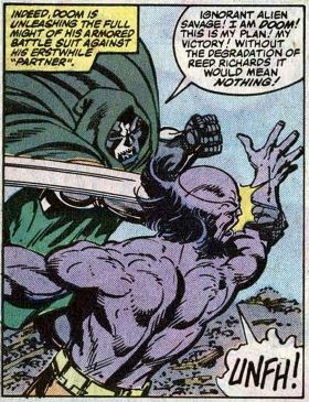 Then, we rejoin the battle with Tyros. Fighting! Tryos is able to use his earthbender-style powers to counter any attack that Ben, Johnny, and Sue throw at him. Sue fires her FF signal flare into the sky, in the hopes that Reed will see it and help. Dr. Doom, watching all this from his spaceship high above New York, also sees the flare. As the minutes tick by, Doom realizes Reed isn’t coming. Doom doesn’t want Reed to miss the deaths of his loved ones, so Doom transports down to the surface and joins the fight in person.