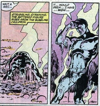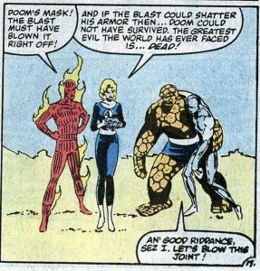 The Silver Surfer grabs Tyros and flies him way up into the atmosphere. They both turn into a giant fireball flying back down to Earth. (It’s the whole “burning up in the atmosphere” thing.) They crash land right on top of Doom, causing a massive explosion. Sue contains the blast in a force field, which pushes her back. This is this issue’s opportunity to remind us that she’s pregnant, when she insists that neither she nor the baby were hurt. The Silver Surfer rises from the wreckage, saying he’s won. Tyros’ body has completely melted away, and Doom’s burned-up mask is found in the wreckage. Sue calls it, saying “the greatest evil the world has ever faced is… dead!”