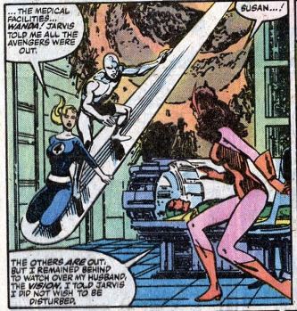 The Silver summons his surfboard from where it was buried in the wreckage of the Terrax/Tyros fight. He and Sue travel to Avengers mansion. The Scarlet Witch is there, watching over the still-comatose Vision. She tells Sue what she saw when Reed was abducted (in issue #257). The Silver Surfer uses the power cosmic to do the “psychic investigator” thing to confirm that Reed is no longer on Earth, but was transported somewhere way out in the cosmos.