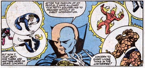 Trivia time: OK, so the story goes that this whole story is the product of infighting between John Byrne/FF editorial versus Chris Claremont/X-Men editorial. Remember when Lilandra made her dire warning to the FF in the pages of Uncanny X-Men? That was allegedly done without Byrne’s knowledge. Byrne was allegedly pissed off, and wrote this story arc as a response. I’m throwing the word “allegedly” around a lot, because the truth of what happened totally depends on who you talk to.
