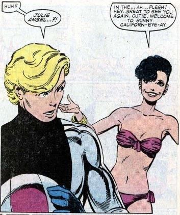 Fade out: This issue’s letters page makes a big fuss about “Sue’s Coiffure Contest,” in which readers could submit designs for Sue’s new hairstyle. John Byrne got into the act by drawing this: