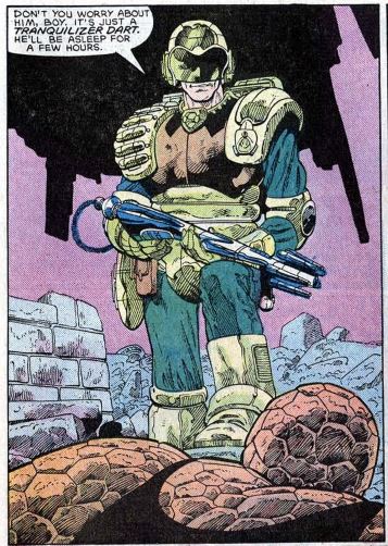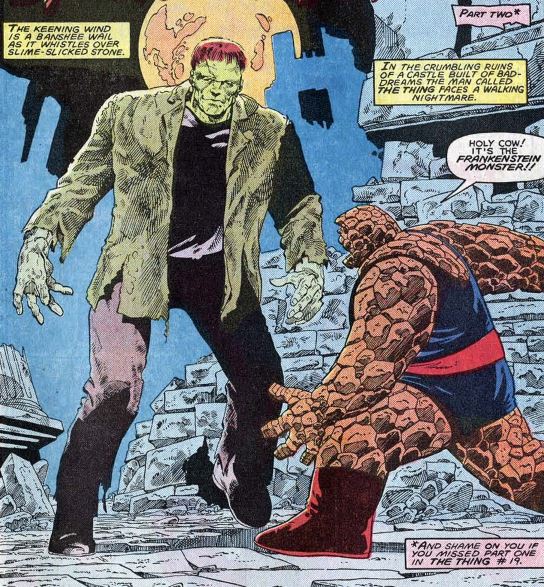 Clobberin’ time: The rumor is that this crossover issue came about to boost sales for the Thing solo comic. All the Universal monsters stuff doesn’t really get across the far-out sci-fi that was happening in that series, though.