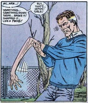 Reed and Sue head outside and find Cromwell at the center of the mysterious light. Reed has heard of her, saying she’s a world-renowned exorcist. She accuses them of witchcraft. Reed comes clean and tells her that they’re really the FF, but Cromwell doesn’t believe it. She zaps Reed with magic electricity. Sue tries trapping Cromwell in a force field, but Cromwell easily breaks through it. Cromwell then summons up the fires of Hell (!) and demonic hands burst through the ground, dragging Sue downward. Reed tries to stop them, and one of them, impossibly, breaks Reed’s arm. That gives us this terrifying panel: