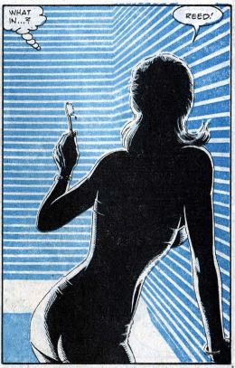 In Connecticut, where Reed and Sue are living with secret identities to raise their son, they’re having a dinner party to get to know their new neighbors. They’re being spied on by superstitious neighbor Alma Chalmers. Chalmers believes Reed and Sue are performing witchcraft, and she and a mysterious woman named Elspeth Cromwell discuss how a dark hour is about to befall the town. After the party, Franklin tells Sue about a dream he had, about an evil lady and the house being swallowed by a man with horns. Sue assures him that it was only a dream, but secretly she worries about whether Franklin’s mutant powers are returning after his encounter with the Spider-symbiote a while back. Reed is taking out the garbage when he is blasted with a white light. Sue is brushing her teeth while only in her undies (wha-hey!) and she gets blasted by the same light.