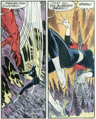 Bottom half: Mephisto turns his attention to Sue, saying that it’s impossible for them to die in his world, which lets him hurt them as much as he wants. To prove his point, he impales Sue on a sharp rock, which doesn’t kill her. (Dang!) He says torturing them makes him more powerful.