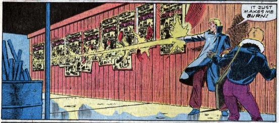In New York, Johnny and Alicia (who is, of course, secretly Lyja the Skrull in disguise) are out for a night on the town, discussing how Ben is back on Earth, but off on his own and no longer a member of the FF. Then they come across a bunch of posters with racial slurs on them. (The “n-word” is prominently featured in this, a Marvel comic book.) Furious, Johnny finds the perpetrator, who is a teenage kid. He lets the kid go, but burns all the posters. A strange figure in body armor watches this from a distance.