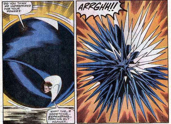 At the roof of Avengers Mansion, Reed has already invented a device that will counter-attack the “hypno-poison” affecting all of New York. Before he can turn it on, Malice (really Sue) attacks, and we get several pages of her fighting Reed and then Johnny. She’s able to fight them easily, with them not realizing she’s using invisible force fields.