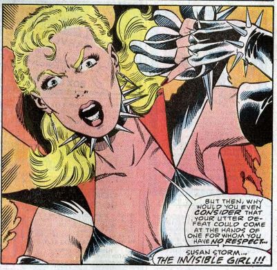Daredevil joins them, asking why they’re fighting an amorphous blob. This is because his radar sense only picks up a large round shape instead of a woman. Reed figures out that DD is “seeing” a force field around Malice, and he figures out it’s Sue. She unmasks, and gives a big speech about how Reed doesn’t respect her.