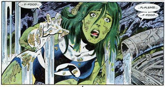 To recap: The FF have traveled into the Microverse so Sue can enact revenge against Psycho-Man for him taking over her mind. They defeated the villain, but not before She-Hulk got zapped by Psycho-Man’s fear ray. Overcome with fear, She-Hulk gets sentenced to work in a Microverse mine. That’s where we begin, where she’s using her strength to pull a gigantic wagon full of boulders. She has apparently lost her strength as well, because her new masters are beating on her, and denying her food and water. This goes on for a few pages, and it’s pretty harsh.