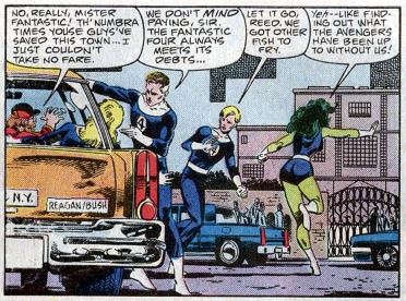 We begin with the FF in space, returning to the Earth after several weeks away. We’re not told why they went to space, only the detail that they’ve had some unexpected detours on the way home. (A lot of Marvel fans have scoured the comics to try to find what issues these space adventures have occurred in, with no luck. I for one like the idea that these unseen stories are just another day in the office for our heroes.) There’s an entire page of dialogue devoted on whether to land the spaceship at JFK airport or LaGuardia airport. The FF must land a LaGuardia because the Avengers have JFK on lockdown due to a crisis. The FF land and take a NYC cab (!) to Avengers Mansion.
