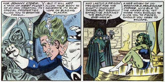 Reed joins the fight, and everybody confronts Doom. He’s ready for them, knocking them all out with some sort of gravity machine. Our heroes wake up, each in a cage doom has designed for them. Reed and the Wasp are in a porous sphere that lets air in but no physical objects out. Sue is in an energy field precisely tuned to her force fields. Johnny submerged in “inert fluid,” which lets him breath but suppresses his flame, and She-Hulk is surrounded by invisible molecular chains that will slice through her otherwise impenetrable skin if she tries to move. Doom takes off his mask to reveal (again) that his mind is in the body of Norm the innocent bystander.