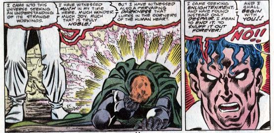 Reed asks the Beyonder to “look beyond this mortal form,” and only then does the Beyonder remember Doom stealing his power. The Beyonder is ready to kill Doom, saying he intended to banish Doom somewhere far out in time and space. Reed interrupts, deducing that when the Beyonder gathered all the heroes and villains for the Secret War, the Beyonder summoned Doom from a point in the future — this point in the future, in fact. Reed pleads with the Beyonder not to kill Doom, because if he does, it will sever the time loop the Beyonder initially created. Doing so would destroy all of time itself, an event that not even the all-powerful Beyonder could survive.