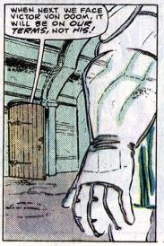 The Beyonder then goes into “fix continuity” mode, restoring Doom’s original body, giving Norm the bystander his own brain back, and then sending Doom back in time to fight in the Secret War. The Beyonder vanishes, and Reed frees the FF from their cages (the Beyonder freed him during their talk). Reed says they’ve got to escape the embassy, because the time loop is about to complete, with Dr. Doom returning from banishment in time and space to fill the absent space he left behind at the start of all this. (Or something. It’s real confusing.) To protect the innocent bystanders, the FF leave seconds before Dr. Doom rematerializes. Reed promises that the next time the Fantastic Four faces Doom, it’ll be on their terms.