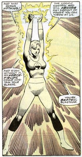 Inside Blastaar’s headquarters, now revealed to be a spaceship of some kind, he has taken Reed captive, and he continues gloating some more. Reed warns that he entered the Negative Zone unprotected, so if too much of the Negative Zone’s antimatter touches him, it’ll cause a massive explosion. The FF smash into the room, and there’s a big fight between them and Blastaar. He holds them off easily, until Sue invisibly snatches the control rod away from him. With a wide grin, Blastaar tells Sue not to throw the rod into the nearby atomic disintegrator. Johnny actually falls for this, and tosses the rod through the door. Blastaar gloats even more, saying even though he’s defeated, he’s still come up with a way to defeat the FF.