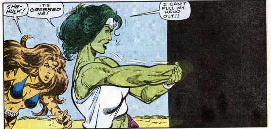 Fantastic fifth wheel: There’s another reference to She-Hulk being just as strong as the Hulk, so the writers were definitely attempting to build her up as one of Marvel’s most powerful characters.