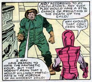 We see the Mad Thinker coordinating all this from inside his jail cell. The idea here is that he can mentally control his entire network of machines from anywhere, so as long as his body is just sitting there in his cell, there’s nothing the cops can do. We then cut to the Wizard’s hideout (we’re not told where this is, exactly) where the Wizard and one of the Thinker’s androids discuss their next move. The Wizard was watching the battle and saw Franklin’s dream-self there. He wants to use Franklin’s powers to destroy Reed. The Thinker says his grudge is with the FF and not a little kid, and he refuses to have any part of this.