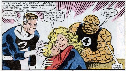 Ben overcomes the brainwashing helmet, explaining it won’t work because he’s a lot meaner and angrier than he used to be. (Is he, really?) Reed and Sue show up, and all three heroes fight the Wizard. Sue knocks him out by cutting off his with a force field around his head. They rescue Franklin and he pleads with them no to hate him because he has powers. Back home, Reed and Sue apologize to Franklin for letting their own fears get in the way of their parenting. They promise not just to accept but to explore Franklin’s powers further, this time as a family.