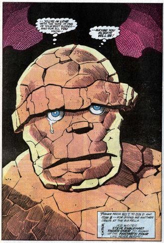 We flash forward again, this time to the wedding from issue #300, only this time Ben is marrying Alicia. He sees a look of sadness on Alicia’s face, and it dawns on him that this timeline is not the way history was meant to go. Ben bails on the wedding. Thundra reappears with a more tech jargon about how she can only return Ben back to the original timeline, and not hers. She does this, and Ben is back where the issue began.