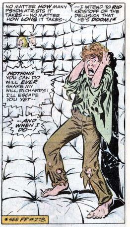 Issue #304 begins simply enough, with Reed, Ben, Sue and Franklin in Reed’s lab as he tinkers with some sci-fi device. There are several pages of recaps, reminding readers of Franklin’s new powers, and Ben’s recent short-lived stint with the West Coast Avengers before he returned to the FF. Reed then makes a big announcement. He says he and Sue are leaving the team to focus more on Franklin, and Reed wants Ben to be the new team leader. Ben says no, thinking to himself that this is just an act of charity on Reed’s part. It’s also during this time that we see, somewhat terrifyingly, Reed still has Kristoff in a padded cell (!), and Kistroff still believes he’s Dr. Doom.