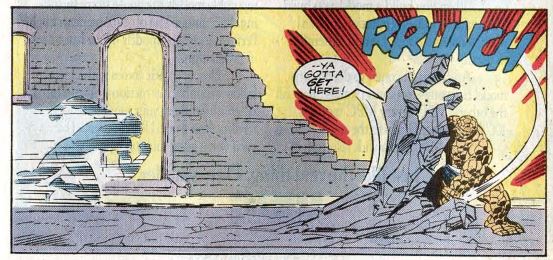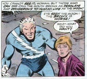Quicksilver takes Alicia to a partially-collapsed building in the Bronx, which this comic depicts as some sort of post-apocalyptic wasteland. Specifically, Quicksilver describes the Bronx as, “Desolate and dangerous to human life,” and his evil plan is simply to leave Alicia there, where she will face death at the hands of “rats and roving street gangs.” He further explains that his wife Crystal (Johnny’s old girlfriend and a former FF alternate member) recently dumped him and had an affair with a real estate agent. Now, Quicksilver is enacting epic revenge by seeking to harm anyone who ever cared about Crystal.