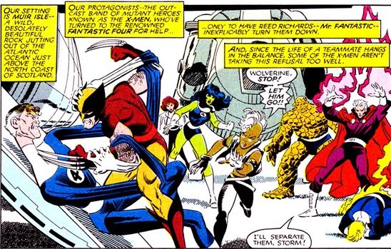 Upon arriving, Reed is overcome with self-doubt, because what was revealed in his old journal. Because of this, he tells the X-Men they can’t use his machine to cure Kitty. This is called Fantastic Four vs. the X-Men, so of course a fight breaks out. Wolverine is, as always, the center of attention, first he knocks out Johnny (it looks like he stabs Johnny, but the comic later says he merely “elbowed” Johnny) and then threatens to slice n’ dice Reed. Storm gets burned by Johnny’s flame, Rogue knocks Ben out by temporarily absorbing Ben’s powers (and his memories), and Psylocke invades She-Hulk and Johnny’s minds. The fight ends when the X-Men’s scientist friend Moira McTaggert steps between Wolverine and Reed.