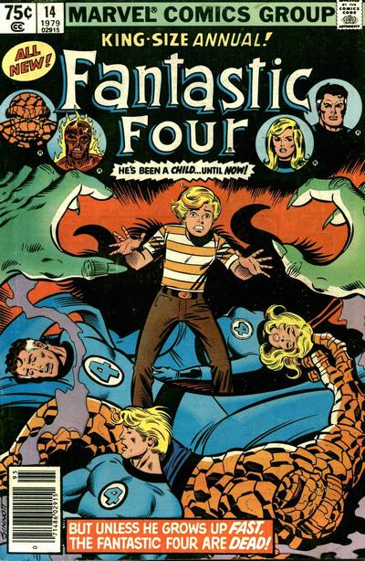 Annual #14 has the FF visiting the magical town of New Salem, where they save the world from an evil cult. Franklin’s magic-using nanny Agatha Harkness plays a prominent role.