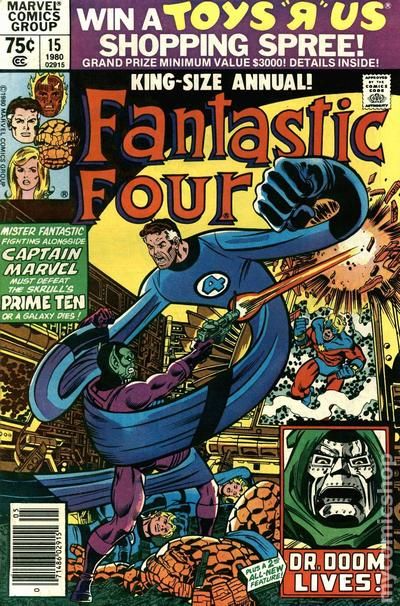 Annual #15 has the FF and Captain Marvel (a.k.a. the alien Mar-Vell) teaming up to fight some Skrulls. A backup story reveals how Dr. Doom recovered from his defeat in issue #200.