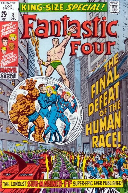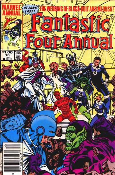 Annual #18 has cosmic beings declaring the long-running Kree vs. Skrull conflict to be settled by a single warrior of each species in a one-on-one fight. Their final battle is to take place on the moon. Unfortunately, this is also happening while the FF are there for Medusa and Black Bolt’s wedding. My description’s not doing this one justice, as it’s some terrific space opera.