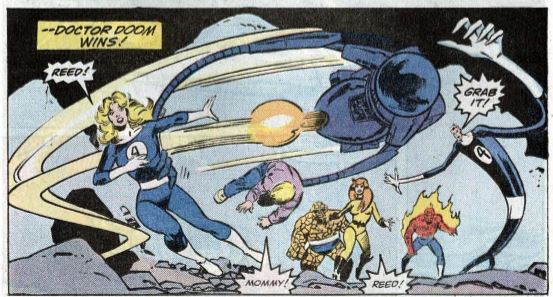 Trivia time: Dr. Doom reveals he’s been secretly spying on Franklin for some time while planning this, to the point where he knows about Franklin’s membership in Power Pack while Reed and Sue still don’t. Doom even knows enough to call Power Pack’s villainous Snarks by their real name, the Sn’rx.