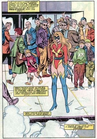 Out in the streets of New York, Captain America shows up with Ms. Marvel. That is, the second Ms. Marvel. A lot of you are probably saying “Who?” right now. For most, Ms. Marvel is either the original, Carol Danvers, who went on to become Captain Marvel, or Kamala Khan, the new teen Ms. Marvel. This one, though, is neither. Meet Sharon Ventura, who was Ms. Marvel during the Thing solo series. We’ll get to her background in a bit. Captain America is just giving her a ride. He reaches out to touch her cheek in a friendly gesture (okay…) and she shies away from him, not wanting to be touched. Cap drives off, leaving her standing there rather bewildered-looking on the streets of Manhattan.