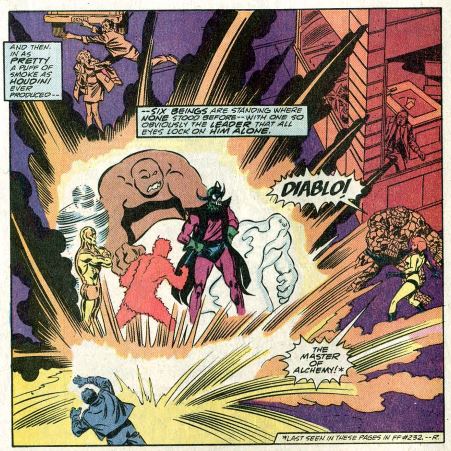 Crystal catches up with Ben and they have a heart-to-heart about how weird it is to be back on the team now that Johnny and Alicia are married. Ben promises that they can tough it out together. Then, out of quite literally nowhere, Diablo appears. He says he wants revenge on the Fantastic Four for trapping him beneath the Earth. (This happened in issue #232, but he later got out and made appearances in other Marvel comics between then and now.)