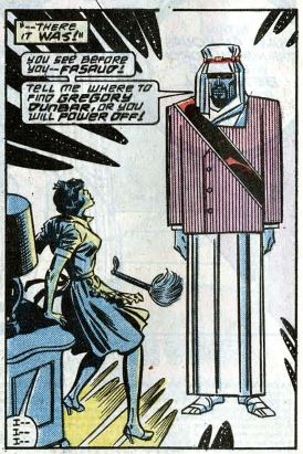 There’s no other way to say it: Fasaud is an Arab Max Headroom. He comes out of television and zaps you with electo-powers. So, yeah. An Arab villain is problematic. An Arab villain with blue skin is even more problematic. Less problematic is that this was years after Max Headroom was popular. Now that the Band-Aid has been ripped off, let’s continue. Fasaud is after Dunbar. He electrocutes the maid, giving her a second-degree burn, and then he vanished. Johnny uses his powers to heal the maid’s burn (!), and then flies off to join his teammates.