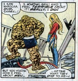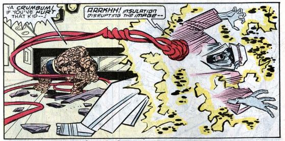Ben uses insulation from some cables as a weapon against Fasaud, which makes Fasaud disappear. Johnny unleashes his nova flame over NYC, but is knocked out. Sharon tries to rescue him, but freezes up because Johnny is a man, and she is reminded of the men who abused her in the past. Instead, Crystal uses her elemental powers to blow up a sidewalk hot dog cart (!), creating an updraft of hot air to cushion Johnny’s fall.