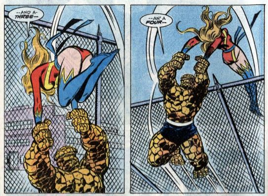 Reading the Fantastic Four comics from the start. In issue #309, the new FF team — Ben, Johnny, Crystal, and the Sharon Ventura Ms. Marvel — continue their struggle against a wacky and rather offensive villain.