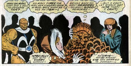 The Alicia problem: Lyja dwells on how she’s hardly seen Johnny since they were married, and how that’s expected when one marries an adventuring superhero. Then she thinks, “I wouldn’t be human if I weren’t glad he sent for me.” Make of that what you will.