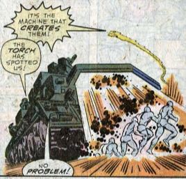 That night, Johnny and Alicia talk while he stands guard at the base. Johnny suspects that the seemingly random adventures of the last few issues might not be random, and the someone or something is pulling the team’s strings. They are interrupted by the sudden appearance of an army of ice men. Fighting! The ice men are no match for Johnny’s flame, Crystal’s elemental control over water, or Ben and Sharon’s strength, yet no matter how many our heroes destroy, the ice men keep coming. Johnny flies ahead and discovers the ice men originating from a tank-like machine out in the snow. He destroys it and captures the men inside.