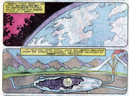 The attackers are mad scientists from A.I.M. (Advanced Idea Mechanics). Ben then has all the characters sit down for what he calls a “conference,” and the rest of this issue is some of the most dense, impenetrable comic book reading I’ve come across in a long time. The gist of it that a variety of aliens visited Earth in ancient times, creating (all?) most of the “hidden continent” stuff in the Marvel Universe, including Atlantis, Lemuria, the Savage Land, and even the city of those underground cat people from a few issues back. There’s a lot of attention paid to massive underground “heaters” which allowed the Savage Land to thrive in the otherwise frigid Antarctica.