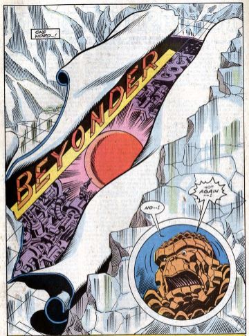 Everybody heads back into the snow to investigate the giant alien heater (I’m still not clear on why, exactly). The FF use their powers to dig deep into the ice, and then to tear open the surface of the machine. Then, to everyone’s surprise, there’s the name “Beyonder” inside the machine, like some kind of giant billboard. “No! Not again!” Ben says, no doubt echoing the thoughts of all the Marvel fans still disappointed with Secret Wars II.