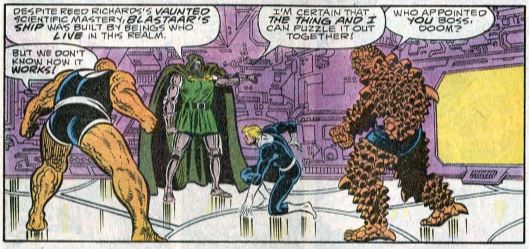 There’s a big fight, in which Blaastar blows the heroes out into space, bombarding Johnny with meteors. Just when it looks like all hope is lost, Dr. Doom flies up and defeats Blastaar by cutting off his oxygen. Doom and the FF hijack Blastaar’s ship, agreeing that they must work together to find the Beyonders.