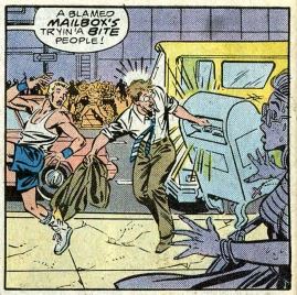 In NYC, the FF are currently the Fantastic Three — Ben, Johnny, and the Sharon Ventura Ms. Marvel. They’re out on the street, where inanimate objects are randomly coming to life. It’s more of an amusing annoyance than a crisis. One guy gets his hand stuck inside a mailbox’s “mouth,” bicycles are riding themselves, et cetera. (What this issue doesn’t say, but what readers are already expected to know, is that all these weird happenings are due to Inferno, an epic X-Men crossover, in which the mutants were fighting to keep demons from invading the Earth, among other things. All the weirdness happening in New York is fallout from those pesky demons.)